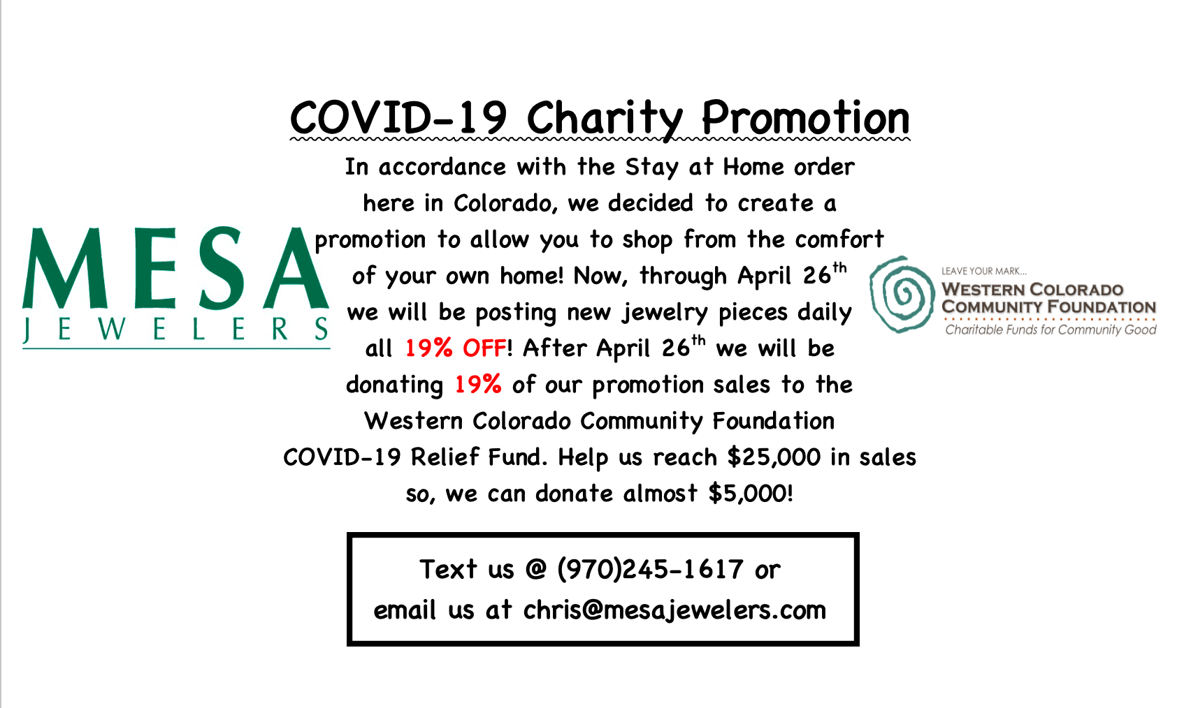 Thank you for supporting small business and Mesa Jewelers!We are offering a 25% discount on all in stock items March 20th through March 31st... Read more